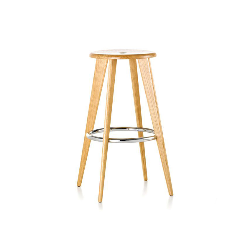 Jean Prouvé 的经典 Tabouret Haut 吧凳采用坚固的实心橡木制成,饰面为自然色或深色。带有防滑表面的镀铬钢环保证了稳定性,并提供舒适的脚凳使用。