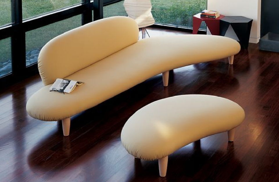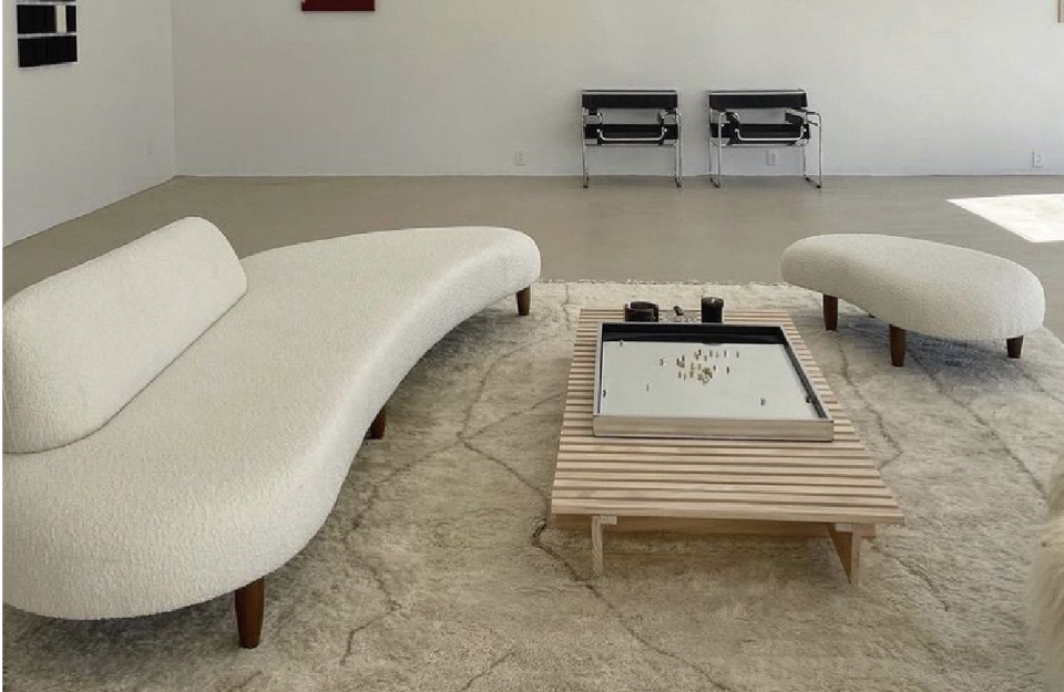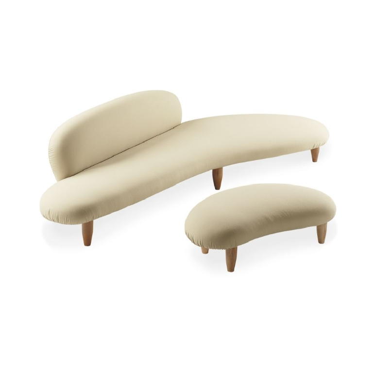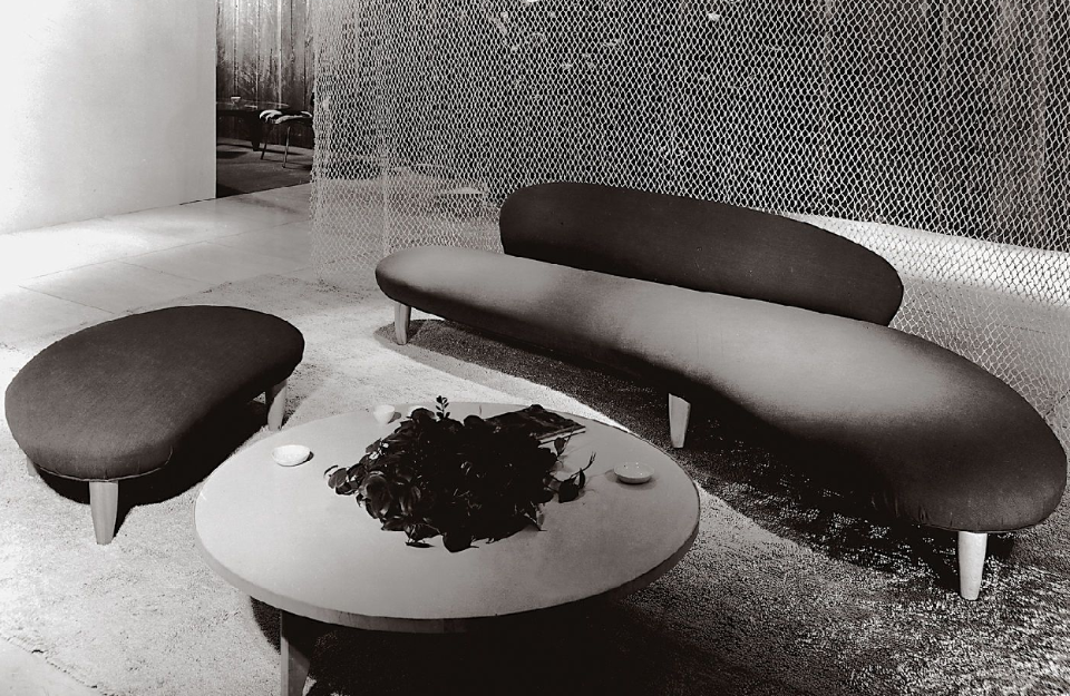 Noguchi设计的雕塑品质体现在自由形式的沙发上:它与同一时期的其他设计完全不同,与奥斯曼帝国结合在一起,就像一个由扁平、圆形的河石组成的放大雕塑。纤细的有机形体流畅优美。Noguchi通过薄而舒适的室内装潢和自然颜色的面料选择,强调了元素的轻盈。