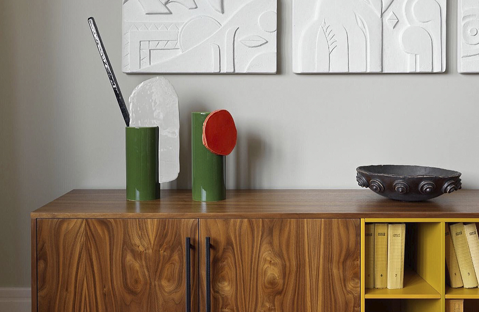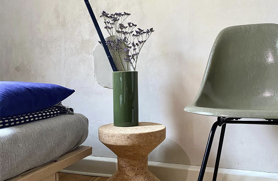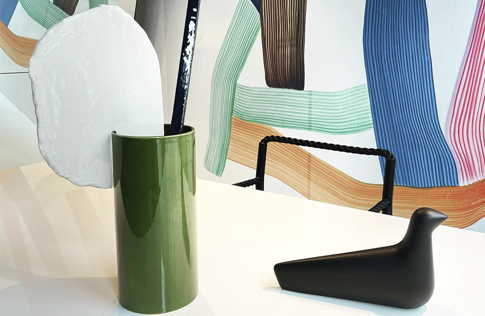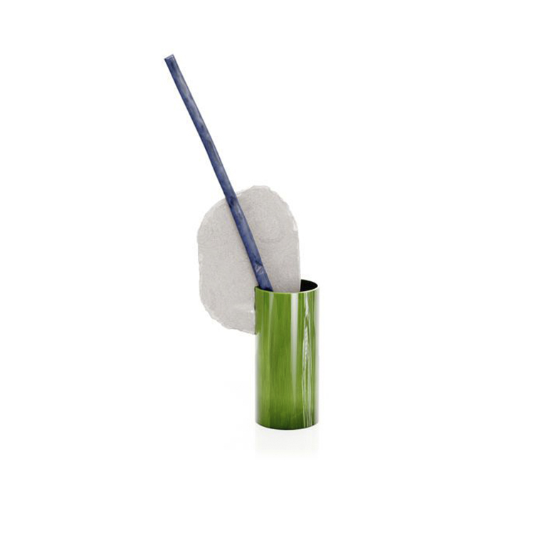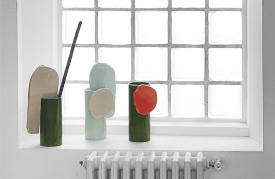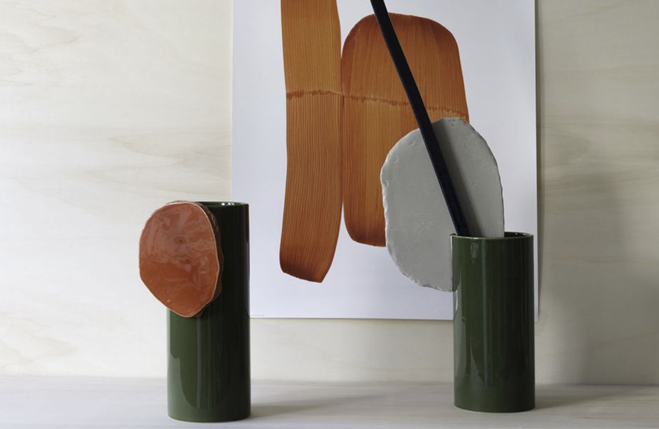 由罗南和埃尔万·布oullec设计的手工浸渍花瓶Découpage(2020年)是由粘土制成的圆柱体、平板和条形物组成的异想天开、充满诗意的作品。