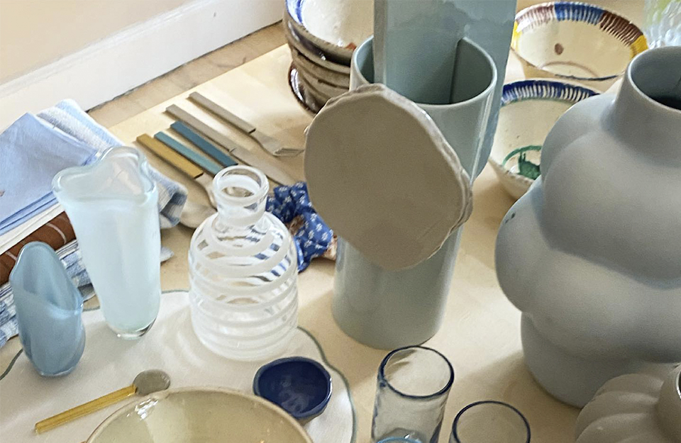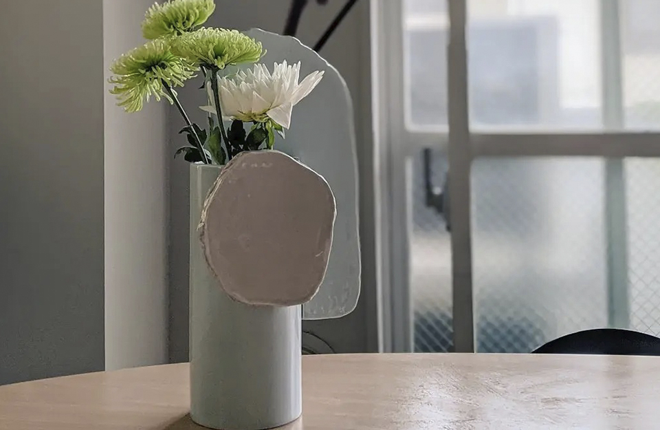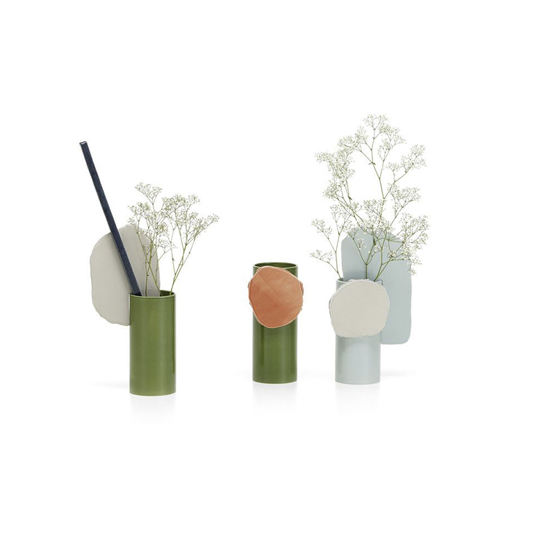 由罗南和埃尔万·布oullec设计的手工浸渍花瓶Découpage(2020年)是由粘土制成的圆柱体、平板和条形物组成的异想天开、充满诗意的作品。