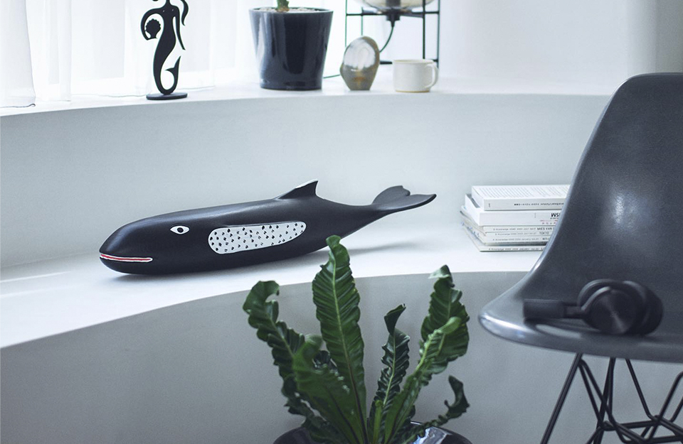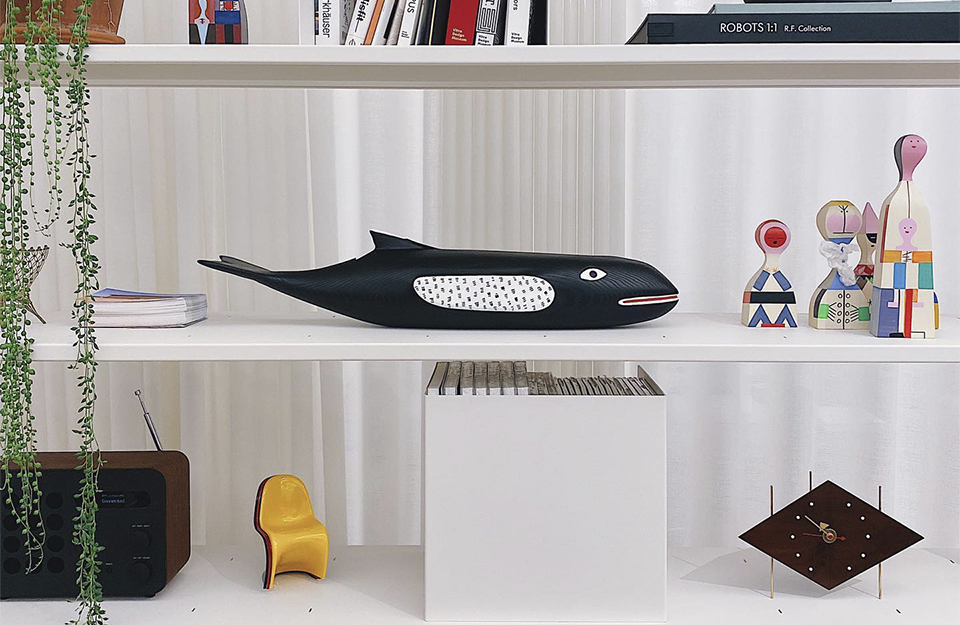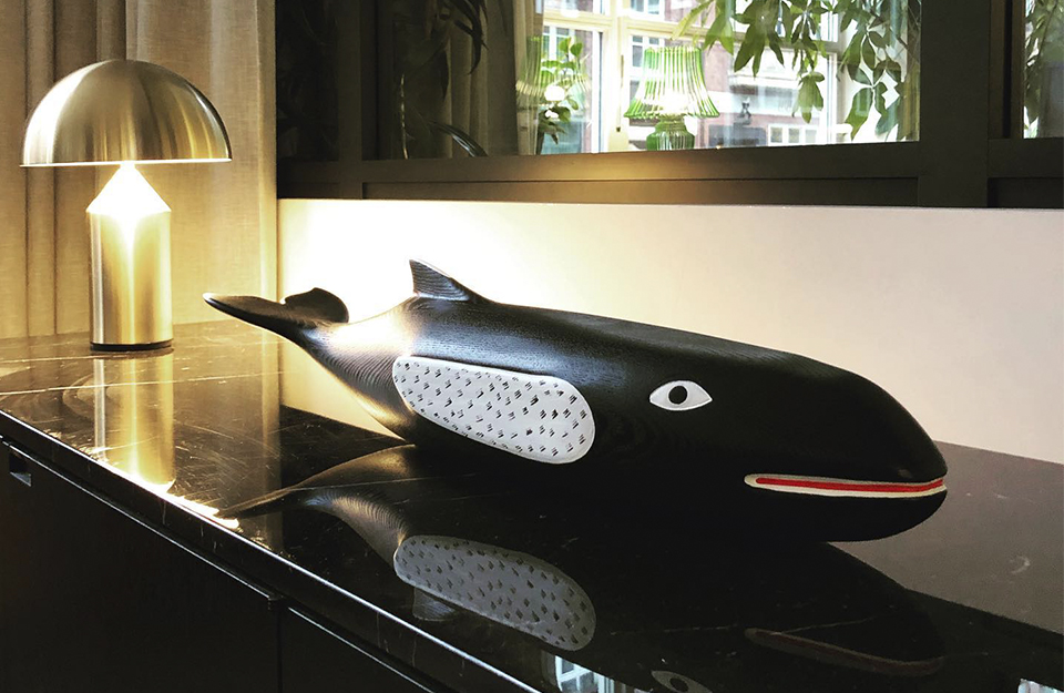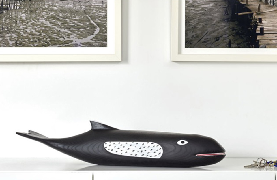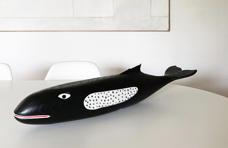 查尔斯·埃姆斯和雷·埃姆斯设计的埃姆斯之屋的一个显著特征是一条超过两米长的木鲸。它的较小复制品是维特拉(Vitra)手工绘制的埃姆斯屋鲸(Eames House Whale),是用灰木制成的。
