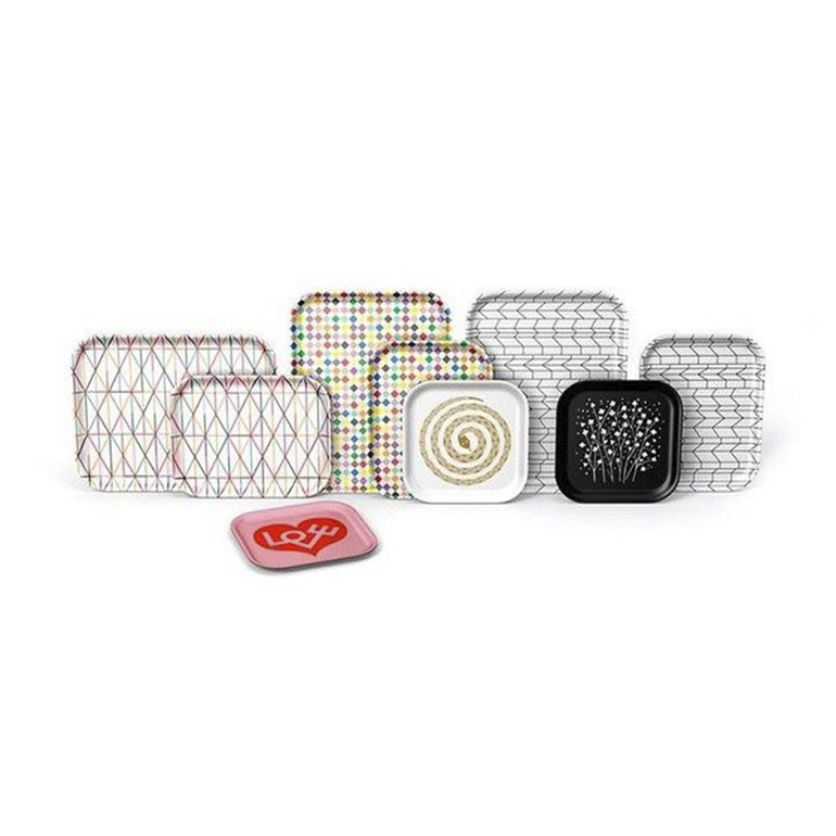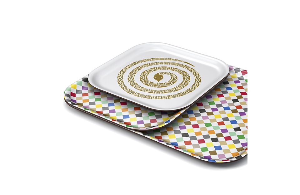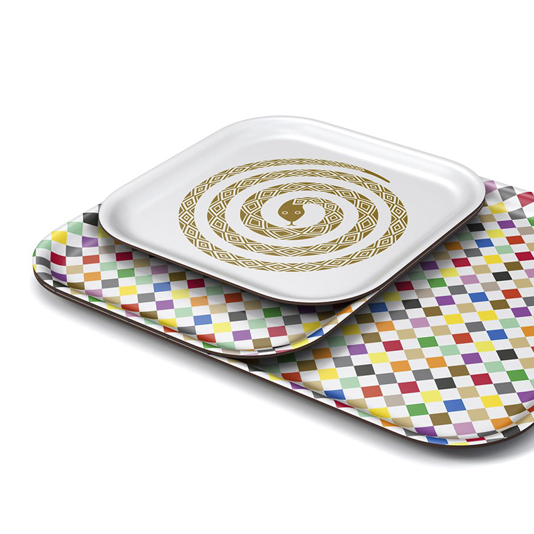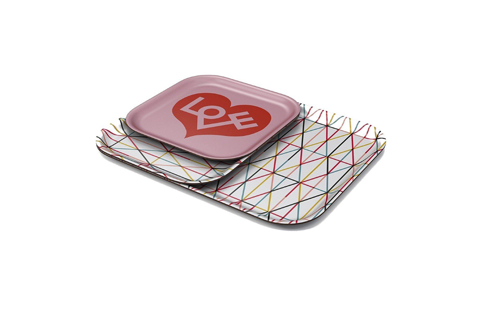 亚历山大·吉拉德(Alexander Girard)和查尔斯·雷·埃姆斯(Charles & Ray Eames)设计的经典托盘(1947- 1974)有三种尺寸。由叠层胶合板制成,它们的特色图案来自这些传奇设计师创造的丰富的图像存储。