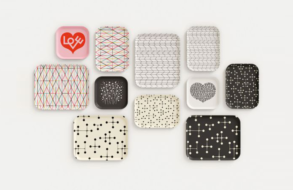 Alexander Girard 和 Charles & Ray Eames 的 Classic Trays (1947-74) 有三种尺寸。它们由层压胶合板制成,具有来自这些传奇设计师创作的丰富图像的图案。