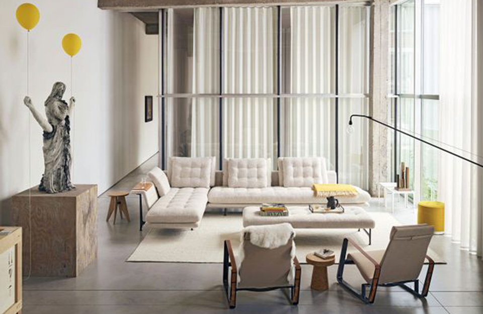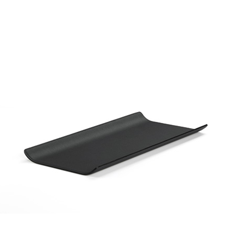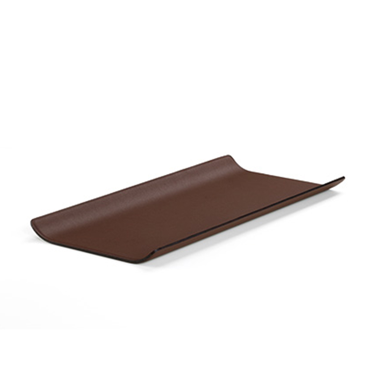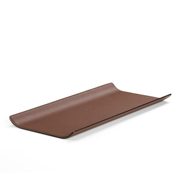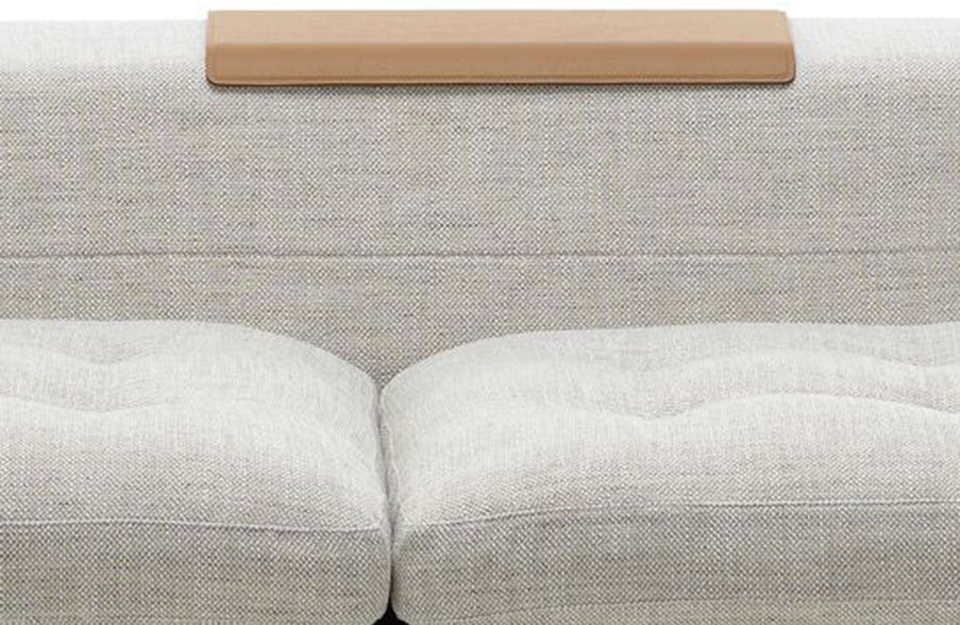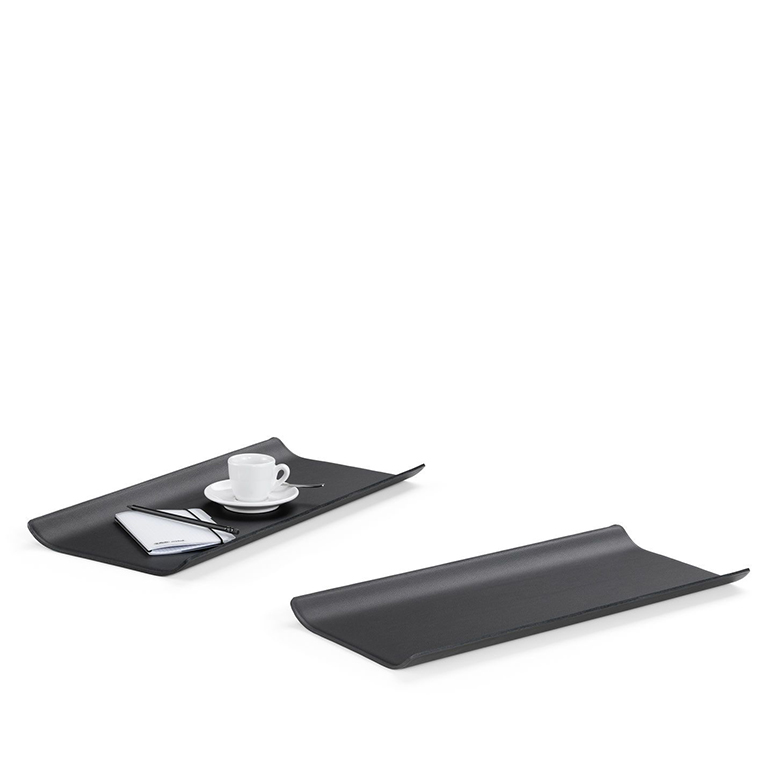 狭窄的矩形沙发托盘(2017)由Antonio Citterio设计,由皮革覆盖的钢材制成,在柔软的软垫表面上提供了一个稳定的存储区域。