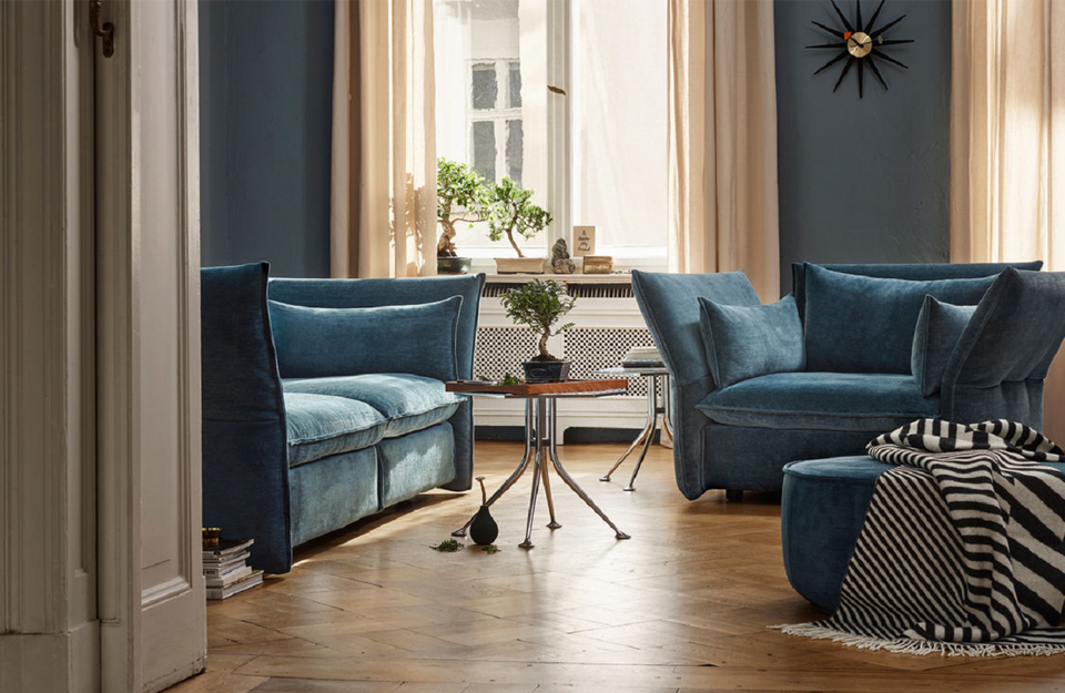 令人愉悦的柔软内饰以及可调节至约 30° 向外角度的侧面板和背面板为 Edward Barber 和 Jay Osgerby 设计的 Mariposa 沙发(2014 年)带来非凡的舒适感。