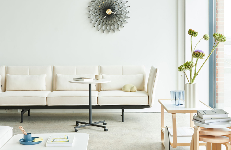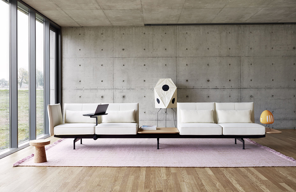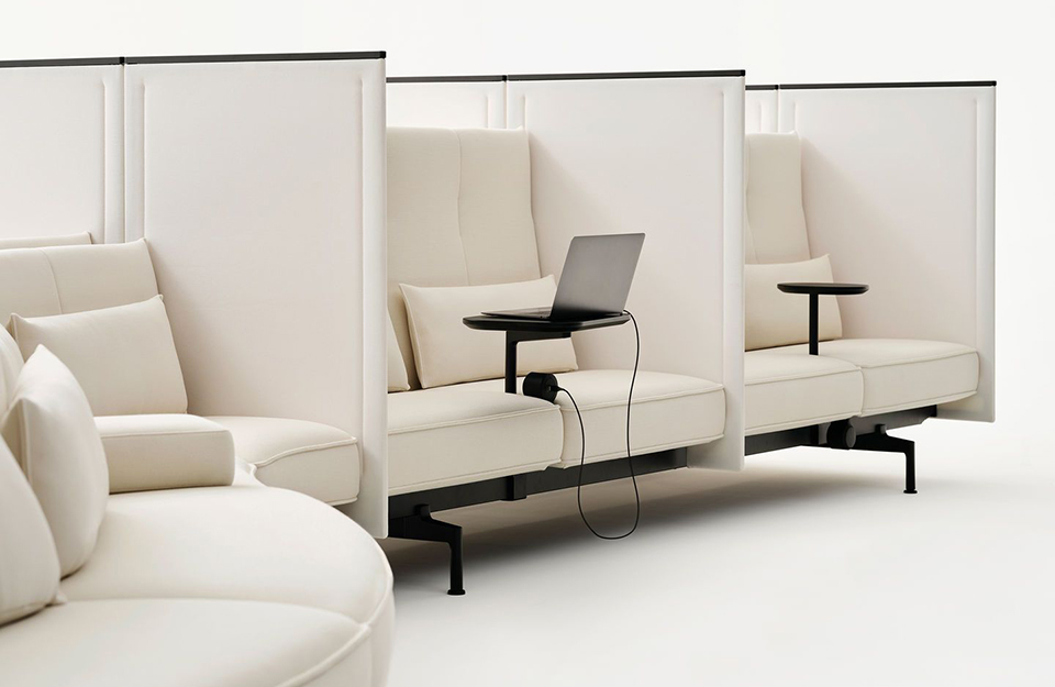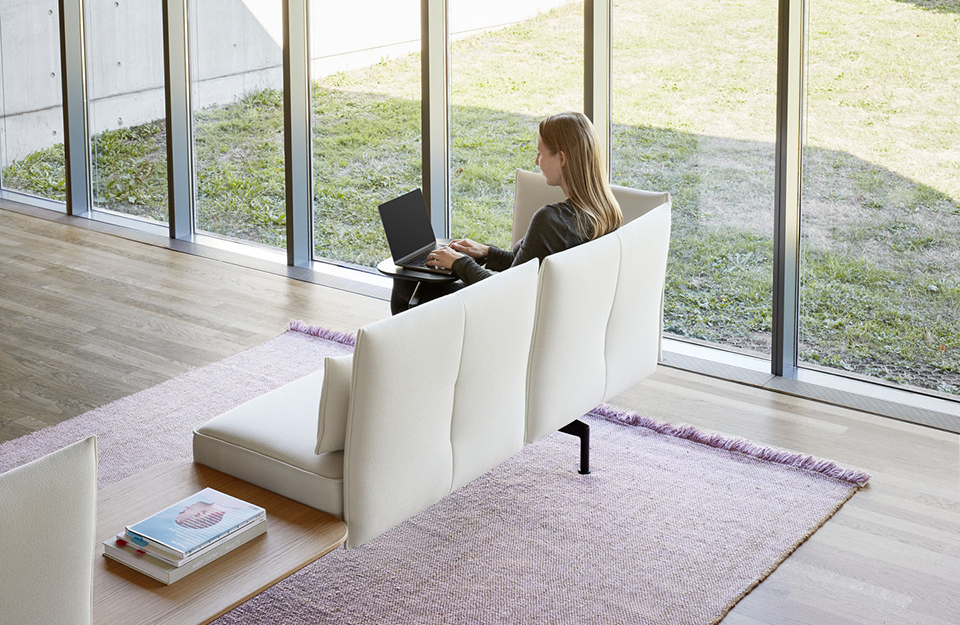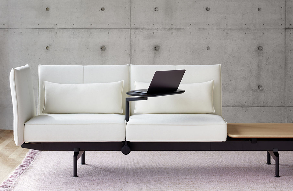 软工作台不仅仅是一个沙发边桌,它也是专门为团队工作而设计的。细长的x形底座,可选配脚轮或滑动装置,允许用户坐在不同的位置。顶部有圆形和船型两种,高度分别为45和71厘米。该表可以集成在各种软工作配置中。